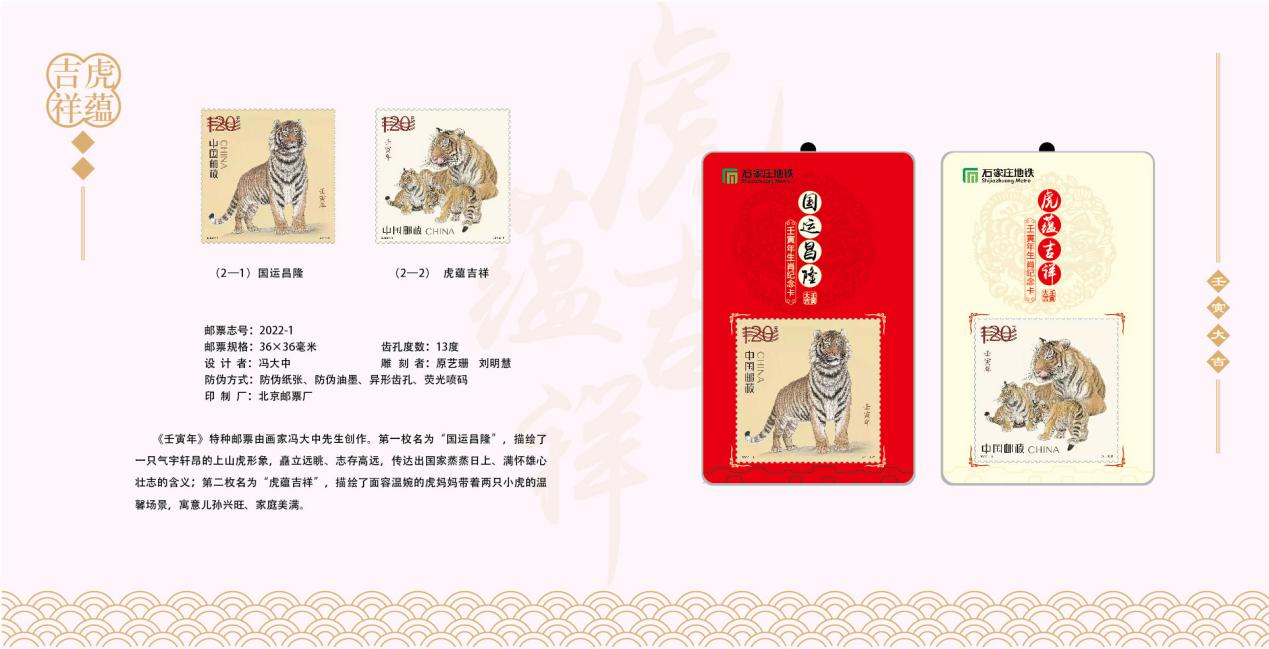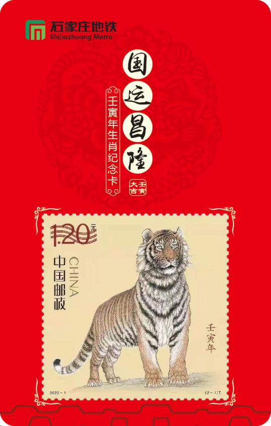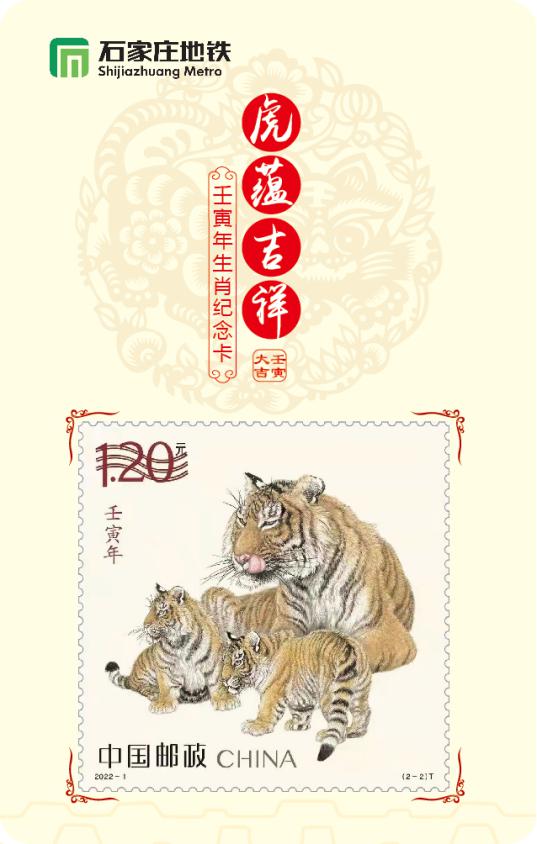 地铁卡二“虎蕴吉祥”,描绘了面容温婉的虎妈妈带着两只小虎威中不失仁厚、猛中带着安详、勇中含着温柔,两只小虎趴在母亲脚下,直视远方的温馨场景,寓意儿孙兴旺、家庭美满。整个画面延续了第四轮生肖邮票的“家国”理念,一套两枚分别展示了国家的期许、家庭的企盼,组合而成浓浓的新春祝福。