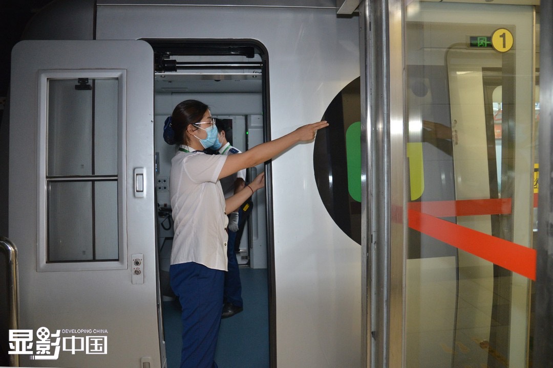 “这是一套安全术语,称作‘手指口呼’,是保障列车出行安全的信号。”作业时以手指指着物件,确认轨道是否异常,信号是否显示正确,广播是否清晰准确,车门是否关闭……口呼确认,眼到、手到、口到、心到。每到一个站点,陈潇都会做这种手势,枯燥乏味但她一丝不苟。