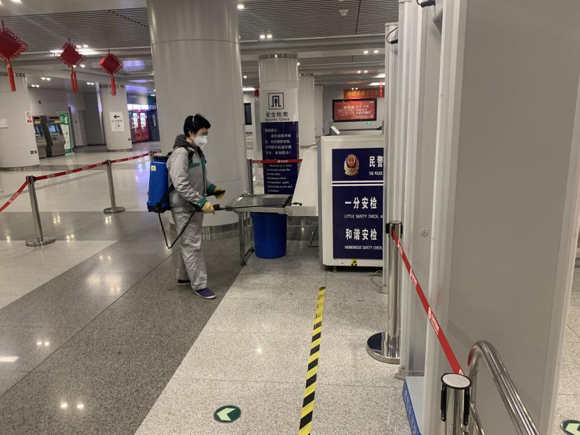早上4点左右,夜班保洁在班长的带领下开始运营前的全方位消毒工作,主要是公共区地面、卫生间、闸机、售票机、栏杆、铁马、隔离带、扶梯把手、安检设备等。