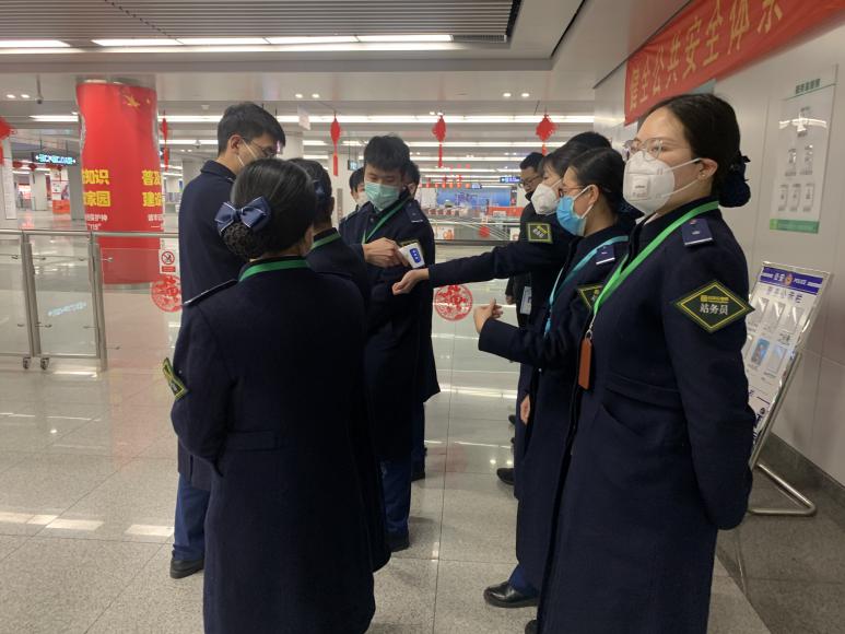 6点,早班保安和安检到达车站,值班站长在监控下开始全员体温检测工作,确保每一个在岗工作人员的健康,是保障乘客安全的基础。自1月22日开始,新百广场站开始测温工作,要求安检做到逢进必检,逢人必测。同时,每个安检点设置“留置观察处”,放置一定数量的口罩,安检全程佩戴口罩和手套上岗,一旦发现发烧乘客立即采取隔离防护措施,按照程序上报。