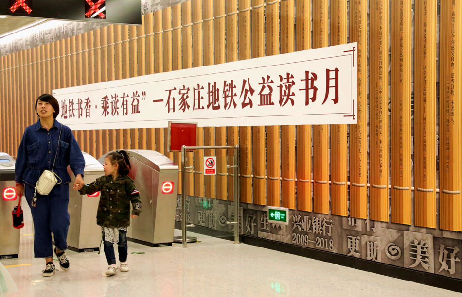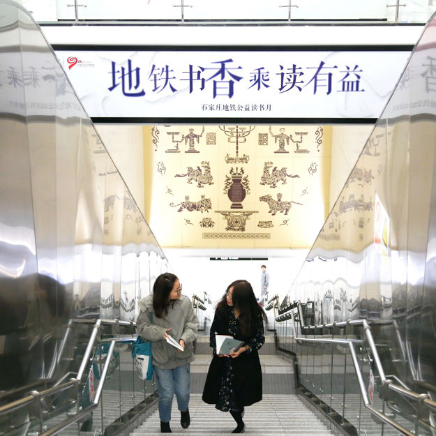 4月22日,以活字印刷术为创意理念的创意印象图书馆落地石家庄地铁博物院站。当日,石家庄首届“地铁书香、乘读有益”读书日公益活动开启。据介绍,石家庄地铁图书馆以创意独特的“活字印刷”浮雕墙贴,活字印刷术与现代图书馆古今合璧,800平方米场景中的竹简上印有各年代畅销书的经典语录,有书籍经典语录的书签,恢弘震撼的图书馆场景让每一位乘客都身临其境,进入书香的世界,为省会市民营造出一个具有浓郁文化色彩的读书氛围。
