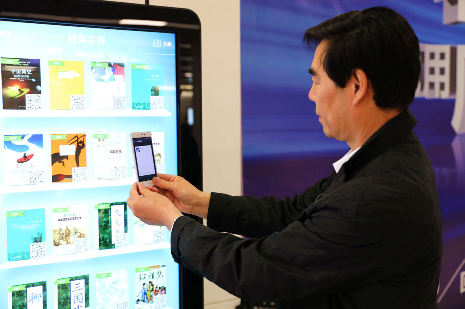 市民通过扫二维码的方式在地铁数字图书馆借阅图书。