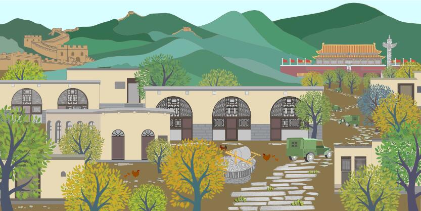新中国从这里走来!西柏坡是全国公认的红色革命圣地。整幅画面突出西柏坡是中国革命事业走向胜利的“一面旗帜”这一鲜明主题。松柏、白鸽、西柏坡旧居等各种元素点缀其中。整面红旗采用竖向红色线条组合,打破了平面的呆板感,鲜活灵动,韵律感强,同时象征中国革命事业蒸蒸日上、充满生机;松树、白鸽象征中国人民爱好和平、革命江山永驻;解放战争场景人物象征着中国共产党人艰苦卓绝的革命精神。“新中国从这里走来”八个字是黄镇将军题写的。