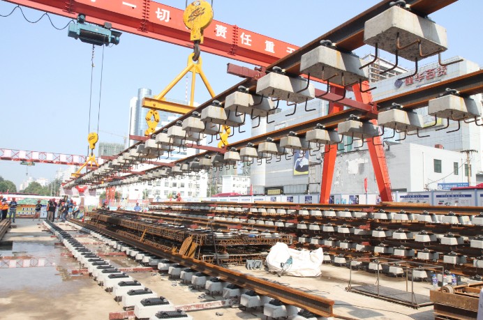 轨排拼装完成后,由龙门塔吊将其从轨排井吊入地下。虽然这个轨排重约4吨,但在工人师傅的操控下,龙门塔吊的绳索仿佛两只有力的手臂,牢牢将轨排抓住,并精确地投放到地下17米深处。“下一步,由铺轨门吊将轨排吊铺到位,通过调整轨道几何尺寸、浇筑混凝土等工序,使之形成整体道床轨道。”该负责人指着已经浇筑完成的整体道床告诉记者,我市地铁正线也全部采用整体道床,它由混凝土整体浇筑而成,安全系数高,舒适性较碎石道床好。此外,在轨道铺设过程中,遇到医院、住宅、学校等振动敏感建筑区域,将采用钢弹簧浮置板道床、隔离式减震垫、减震器道床等技术,最大限度减少对周边居民生活、学习的影响。